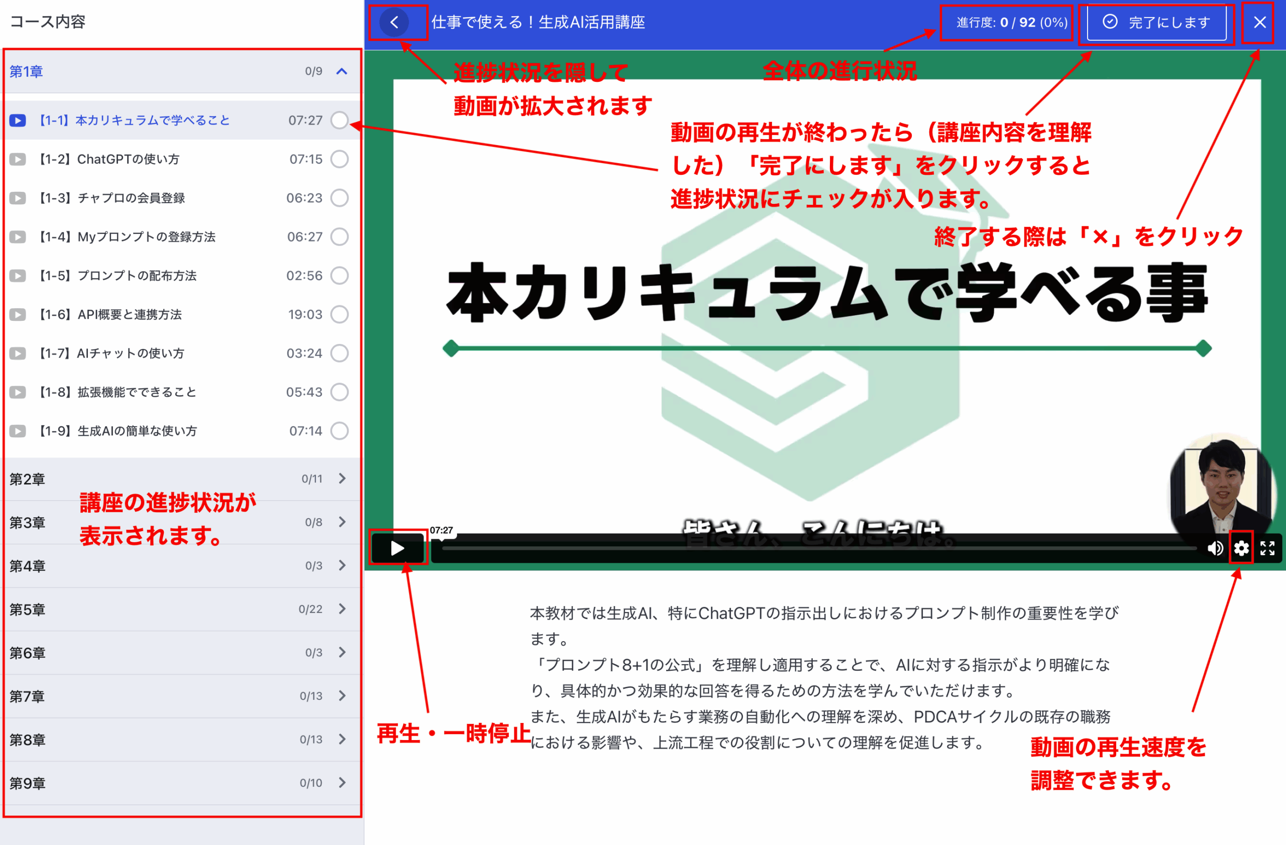 赤枠「学習を開始する」をクリックして受講を開始してください。